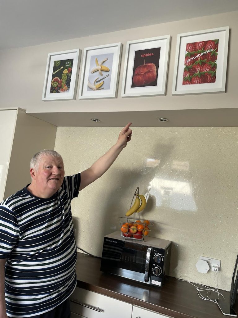 Once the kitchen was completed the service users at Gartmore designed to do some art to help decorate it. Gordon decided on a fruit theme and each service user chose their favourite fruit to frame and hang on the wall. He took great pleasure spending several months working on it and we got some photos of Gordon proudly admiring the amazing outcome.